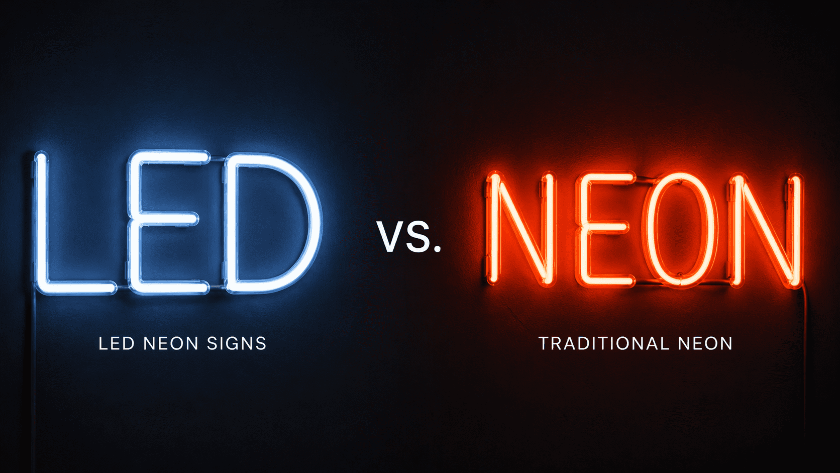 Traditional neon uses hand-bent glass tubes filled with gas that glows when electrified. LED neon uses flexible silicone tubing with LED strips inside. Glass neon has a warmer, deeper glow. LED neon is lighter, cheaper, safer to handle, and easier to maintain. Same look from a distance – very different products up close.